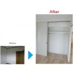 (パナソニック ホームエンジニアリング株式会社での事例です。) 和室をなくしてリビングを広くし、残りのスペースをウォークインクローゼットにし、洋室にもそれぞれ壁一面のクローゼットを造りました。ダイニングに光が届くようになったので、キッチンを移動させ、カウンターも設置。ダウンライトを配し、より一層明るくしました。キッチン移動により、空いたスペースをシューズクロークにし、玄関→リビングと、玄関→シューズクローク→キッチンの2WAY動線を実現しました。(工期:35日)