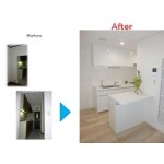 (パナソニック ホームエンジニアリング株式会社での事例です。) 和室をなくしてリビングを広くし、残りのスペースをウォークインクローゼットにし、洋室にもそれぞれ壁一面のクローゼットを造りました。ダイニングに光が届くようになったので、キッチンを移動させ、カウンターも設置。ダウンライトを配し、より一層明るくしました。キッチン移動により、空いたスペースをシューズクロークにし、玄関→リビングと、玄関→シューズクローク→キッチンの2WAY動線を実現しました。(工期:35日)