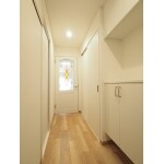 電気温水器の収納庫の扉はほかの木製ドアと同じ面材で製作し交換しました。玄関収納はフロート納めにしてあります。