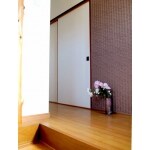 <アクセント/施工後> トイレ前は壁になってしまいましたが、飾り柱を残し和風のイメージを残しております。 またホール正面の壁はアクセントを含め、和風のクロスを選んで補修を兼ねています。