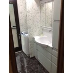 黒とグリーンを基調にして、スタイリッシュな浴室洗面に、床はタイルの床を選定しました。