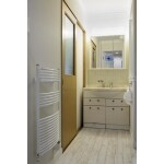 (旧東京ガスリモデリング株式会社での事例です。)トイレと洗面の壁を取り払い、2in1にしたパウダールームは両世帯の共用スペースです。間仕切りや引き戸には、レトロな模様の造作ガラスを採用。洗面台は既製品ですが、ツマミは奥さまの好きなものへ取替。鏡や壁面タイルも採用しました。