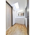 既存トップライトを生かした明るいスペースに洗面脱所を新設することで、解放感のある空間を提案。1階部分から吹き抜けを設置すること室内物干スペース提案。また、洗面化粧台は、収納の使いやすさなど機能性を重視して提案。