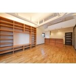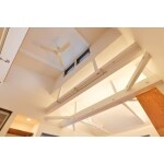 梁を活かした開放感のあるリビングを提案。リビングのアクセントとして壁一面に造作棚を提案。
