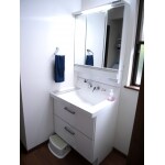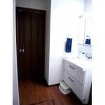 以前の洗面所 洗濯をするとドアがぶつかりました。 生活動線も悪かった。