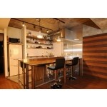 <After> 位置を変え、対面式のオープンキッチンにすることで開放感と一体感が生まれた。 陽が落ちてからは、山小屋風の真骨頂。やや少なめに配灯したスポットライトが落ち着いた雰囲気を演出し、自宅にいながらもまるでダイニングバーにいるような感覚を得られる。
