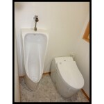 <1階トイレ> 広く使いたいとのご要望通り、頻繁に使用されるには1階トイレは小便器専用と洋式トイレを設置いたしました。小便器用と併用して使えるように、別置き手洗い器も設置させて頂きました。