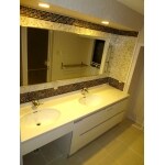 洗面台はお客様のご要望に見合うものをご用意させていただきました。また、シックな色合いのタイルや間接照明などを用いて落ち着いた空間を演出させていただきました。