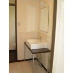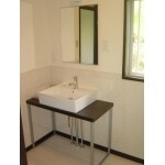 無駄な機能が一切ないシンプルな洗面化粧台を設置された。 水が飛散するので、壁が傷み難く清掃性の良い素材にしたい。