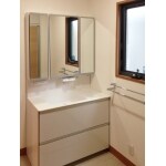 機能的な洗面化粧台に入れ替え、内装もリフレッシュ。 気持ちの良い洗面室になりました。 脱衣時の寒さ対策に暖房機を設置しました。