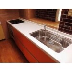 オレンジのキッチンは、茶色系の床と壁との相性は抜群であり、お洒落に仕上がりました。収納し易く、取り出し易いスライド式収納が魅力です。