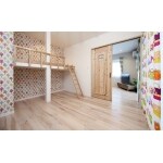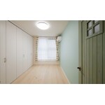 女の子のお部屋は、お嬢様のお気に入りのセレクトの照明、壁紙、カーテン。建具はクリアに塗装しました。ロフトベットでさらに楽しい雰囲気にしています。男の子のお部屋は、ナチュラルグリーンにDIY塗装した建具があるだけで、あたたかい雰囲気になっています。