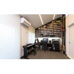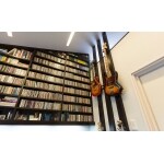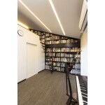 音楽を気兼ねなく楽しめるよう、二重サッシにして防音性を高め、勾配に沿って天井までの棚をすっきりと造作