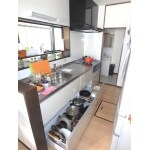 吊戸はだんだんと荷物を出し入れするのがつらくなってきます。今回は思い切って吊戸を無くし、すっきりとした空間を手に入れることができました。スライド式の収納は奥まで物が取り出しやすく、吊戸の鍋類もほとんど納まってしまいました!!【工事費約60万円 内装工事別途】