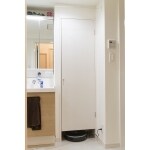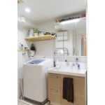 ルンバの隠れ場所を提案 以前の広い洗面台より、少しコンパクトですが三面鏡で収納が増え、右サイドに造作のリネン庫を設置。