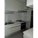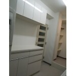 間口270cmのキッチンですが、右端に柱型があり右側45cmにはキャビネットの設置が出来ない状況でした。そこで225cmのキャビネットに270cmのカウンターをのせ、右端を加工して取付けるようご提案しました。 また、最近は不燃化粧パネルでキッチン周りの壁を仕上げることが多いのですが、お客様はタイルの質感がお好みとの事でしたので、できるだけお手入れしやすいよう200角のタイルを用いて目地部分が少なくなるようにプランしました。格子柄が浮き出る白いタイルは光を柔らかく反射して、上品な空間を演出しています。キッチンとの相性も良く、お客様にも気に入っていただけました。