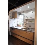 壁側部分は白タイルをベースに、グリーンをポイントにデザイン配置。 オリジナル棚は施主様御支給のL金物を使用し、全体をアンティーク調に仕上げました。