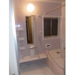 在来タイル浴室を、淡い紫色のアクセントパネルとピンクの浴槽をセレクトして柔らかく女性的なユニットバスにリフォームしました。