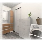 お風呂洗面から洗濯場、そしてキッチンへと生活動線が繋がるプランをご提案しました。
