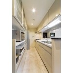 ご家族の様子がキッチンからも見渡せるように、対面式のキッチンをプランさせていただきました。 また、壁面に家電も収納できるカップボードを設置し、収納が豊富で、スッキリとしたキッチンになりました。