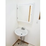 元の洗面はデザイン性があり、お家に合っていたので部品を交換し、収納付きの鏡を付けました。