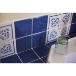 洗面台はドイツ製の陶器ボウルと深いブルーのイタリアンタイルで造作。立ち上げ部分にあしらった白い模様のデザインタイルがエレガントなアクセントに。大きなミラーが視界の広がりを生んでいる。陶器ボウルは深さもあって使いやすく、「ちょっとした洗い物をするのにも便利です」とM夫人。床は水に強い無垢調の素材で仕上げ、高さも廊下と合わせて段差を極力小さくしています。