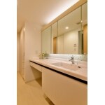 洗面化粧台の壁にはモザイクタイルが、あしらわれて無機質になりがちな空間を演出しています。既存のミラー収納などのは活かしつつ、人工大理石カウンターを新調し、取り付けの際には経常加工しながらピッタリ設置。もちろん水栓も新しくしています。収納量も豊富なワイドカウンターで、ご家族で使っていても不便さを感じさせません。