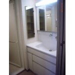 (旧東京ガスリモデリング株式会社での事例です。)水栓金具は、壁から出ているタイプで、水垢がたまりにくく、引き出して使えるのでお掃除もらくらくです。三面鏡裏と、壁埋め込み収納、とボウルについているパックンポケットで収納たっぷり。キャビネットも配管位置が工夫されているタイプの洗面化粧台で、引き出しプラス高さのあるものを収納できる開き扉で充実の収納です。