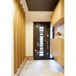 暗いイメージだった玄関まわりの壁を縦格子に変更し、傷がつきにくいようにアルミ角材をシートで巻いて仕上げた。 玄関扉も交換し、明るいイメージに一新した。