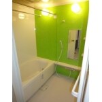 お掃除がしやすい壁パネルのユニットバスをご提案。 今回はアクセントパネルを色が鮮やかなグリーン系にしました。