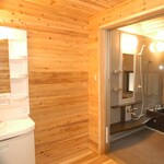 浴室が狭いため、離れを浴室に改築しスペースを確保しました。以前のお風呂に比べ3倍ほど広くしました。それに合わせ脱衣場も広く取り、全面総檜張りにしました。
