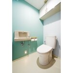 便座にフチがなく、お掃除がしやすいトイレを採用しました。 開きドアから引き戸にすることで、開閉が楽にできるようになりました。 内装は白とブルーの組み合わせで、爽やかな印象の空間になりました。