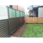 お隣の窓を、塞がない・光も風も入る方法を、ご提案しました。 お隣の駐車場から建物まで 上下2段の高さ2m 上(曇りガラスみたいなパネル) 下(羽が横に重なった様なルーバー式のアルミ形材のパネル) お隣建物際から沿って長さ2m 2段のフェンス下段パネルだけ延長 高さ1.2m 下段だけにする為、柱を加工してパネル取付