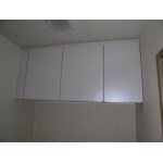掃除が楽なガラストップコンロを提案しました。 吊戸棚にすることで、空きスペースを有効利用しました。