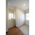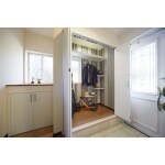 トイレを移設し、玄関のスペースにシューズクロークを設けました。 奥行きがあるため、ゴルフバックやお子様用の自転車などのかさばる物もすっきりと収納できます。 棚やハンガーパイプを取り付けているので外出時に便利です。 シューズクロークの横の窓下のスペースを活かし、カウンターと収納を造作しました。