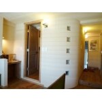 曲面壁にすることで空間を広く見せる効果と、柔らかさを狙いました。 壁面にガラスブロックを縦一列に配置することで、寝室へ程よい光が入ります。