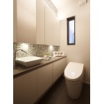 内装の仕上げに、ご主人のこだわりのタイルを、床と壁の一部に採用し、また、今ある収納スペースを使ってプラスαの収納をすっきりと作り上げました。収納扉の一枚は鏡になっていますが、他の扉ともフラットで凹凸感のない仕上がりに。
