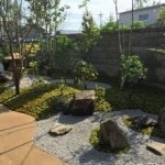 植木の撤去をしますが、思い出のある木を2本再利用します。限られて空間を広く見せる為に、手前から奥に傾斜をとり植木の配置で奥行をもたせます。奥につながる途中に目隠しの生垣を配置し別の空間を奥に持たせました。日本庭園をベースにお客様の好みを取り入れ落ち着きのあるお庭にしました。