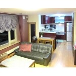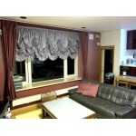 親夫婦のリビングは奥様の好きな色でカーテンも見えるキッチンも統一しました。