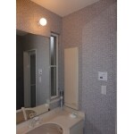 施工後の洗面所です。特に気になっていた、壁をタイル貼りからモザイクタイル柄の壁紙に変更しました。室内の雰囲気も一気に変わり、明るい色合いの部屋から落ち着いた雰囲気の部屋になりました。