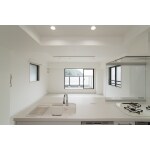 ガラストップのガスコンロに食洗機、白で統一してスタイリッシュなキッチンの出来上がりです。