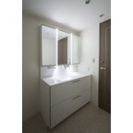 収納を増やして、ボールとカウンターの隙間のないもの。 タッチレス水栓にツインライン照明、三面鏡裏収納!