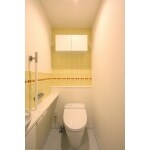 イエローのタイルにボーダーを入れたアクセントタイルが、明るく楽しいトイレ空間にしています。