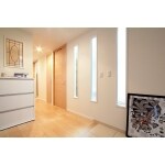 (旧株式会社ハウスドゥでの事例です。)洋室との壁に縦のスリット窓を設け、明るさを確保。 正面にはステンドグラスをご提案し、お洒落な玄関に。