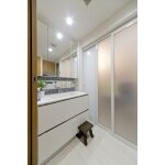 洗面化粧台は、空間に合うオリジナルデザインで同社が手づくり。Oさんが選ばれたタイルで、清潔感いっぱいの印象になった