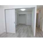 建具関係は床材とリンクさせて同一色に、またリビングとの一体感を持たせるために、3枚引き戸を御提案させて頂きました。