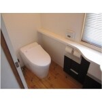 直接、壁紙を貼ってしまうと木のヤニが染み出てくるおそれがあったため、薄い下地材を丁寧に貼って、その上に汚れに強い壁紙で仕上げました。 カウンターや手洗い下の収納家具もオリジナルで制作致しました。最新式のタンクレストイレにぴったりの素敵な空間が完成しました。