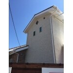 白いサイディングの中でも、色味に変化のあるニチハのアリエッタ デリエMGホワイトにウォールアクセサリーの妻飾りを付けました。 玄関付近は、ニチハのモエンエクセラード ビローネMGレッドで貼わけ。 さらに、趣味の個室を、キャスティングウッド ミディアムブラウンで貼り分けました。