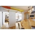 壁構造で撤去できなかった壁に、ご家族で集めたというシーグラスを埋め込み楽しいアクセントにしました。また、頭上にはご趣味のサーフボードを収納できるようにしました。