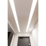 シューズボックスは床から少し浮いたフロートタイプにし、足下の間接照明で落ち着いた空間を演出しながらも、明るさをはキープ。薄茶のエコカラットもアクセントに。 もちろん靴の一時置き場としても活躍します。天井の中央部が一段高くなった掘り込み天井だったので、それを活かしスリットを残して天井を塞ぎ、その内側に間接照明を付け、スタイリッシュな照明の出来上がりです。